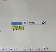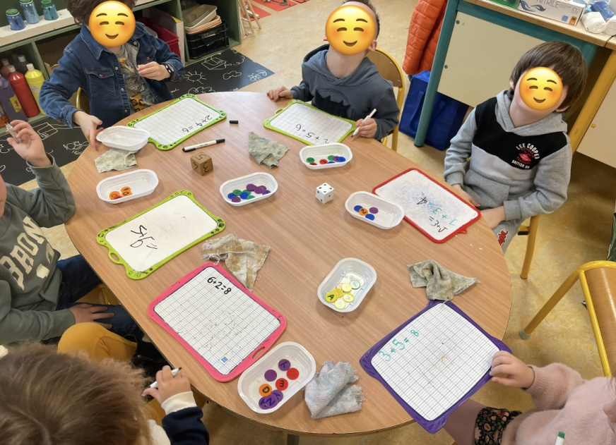 Ensuite nous avons joué au jeu de la tirelire. Les élèves devaient lancer le dé à deux reprises et prendre le nombre de jeton indiqué par le dé. Nous avons même vu les signes « + » et « = »