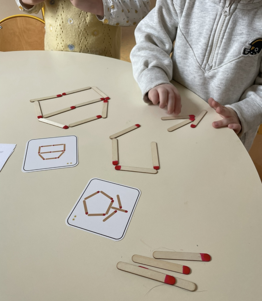 Ensuite les élèves ont découvert un nouveau jeu dans la classe : le jeu des allumettes. Le but est de reconstituer des figures à l’aide d’allumettes.