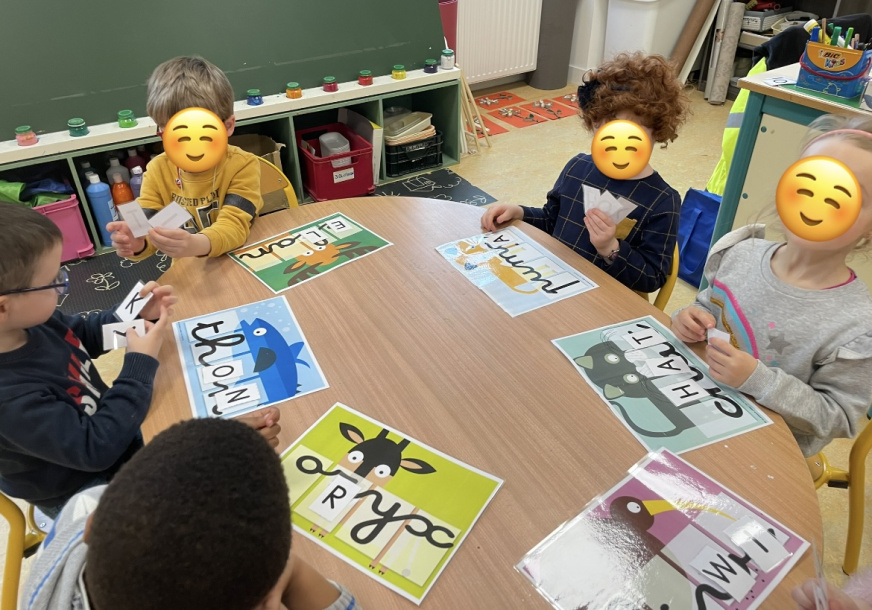 Pendant ce temps nous avons joué au jeu des animaux à 4 lettres, il y avait le chat, l’oryx, le kiwi, le thon, le puma et l’élan. Le but est d’associer les lettres cursives aux lettres majuscules.