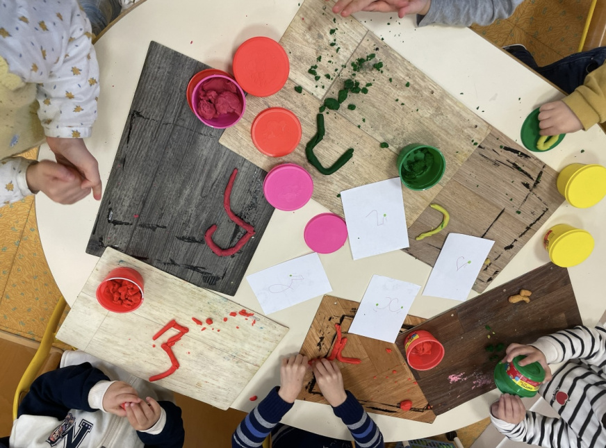 Nous nous sommes aussi entrainés à former les lettres combinés : s, r, x et z en cursive avec de la pâte à modeler.