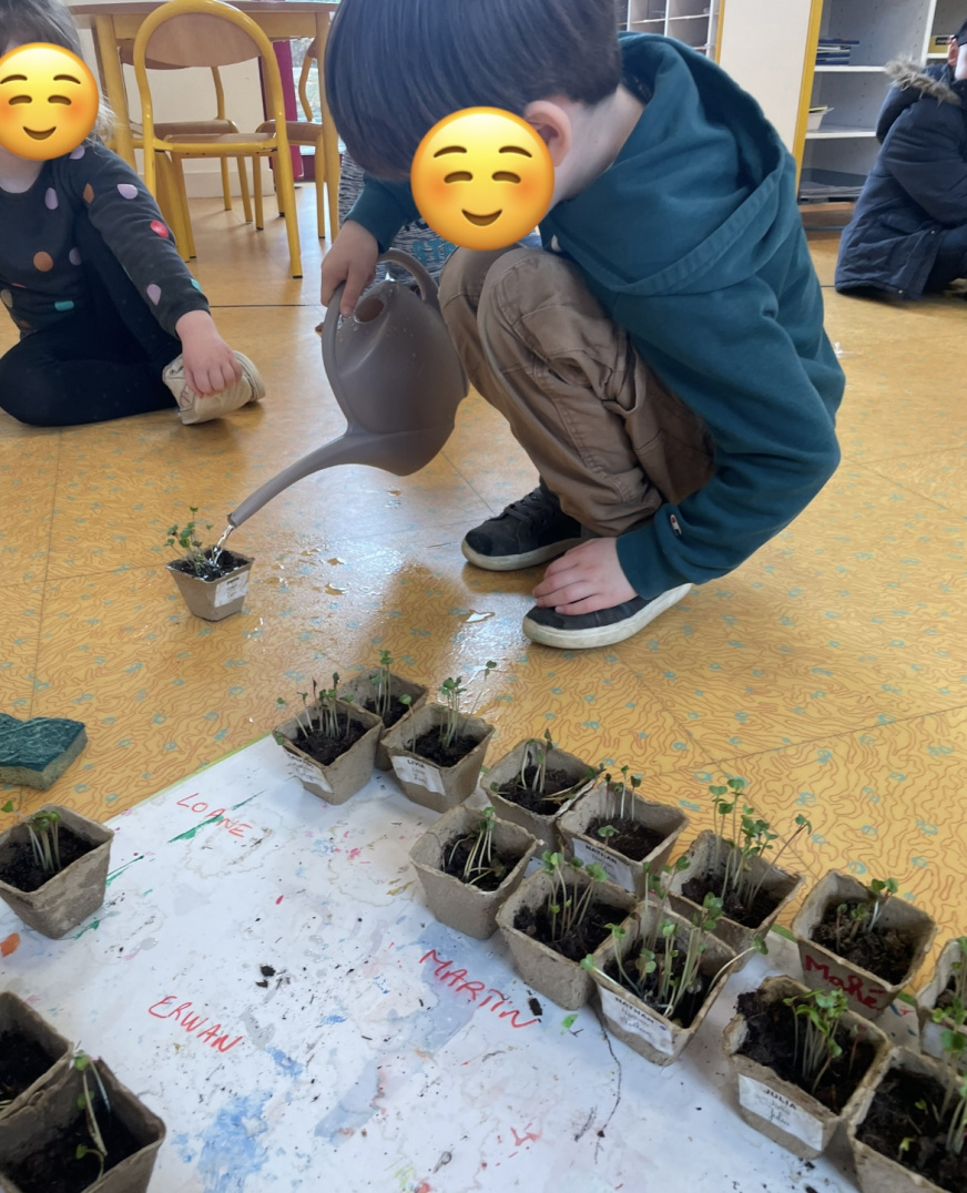Avant d’aller manger, nous avons arrosé nos radis qui ont bien poussé !