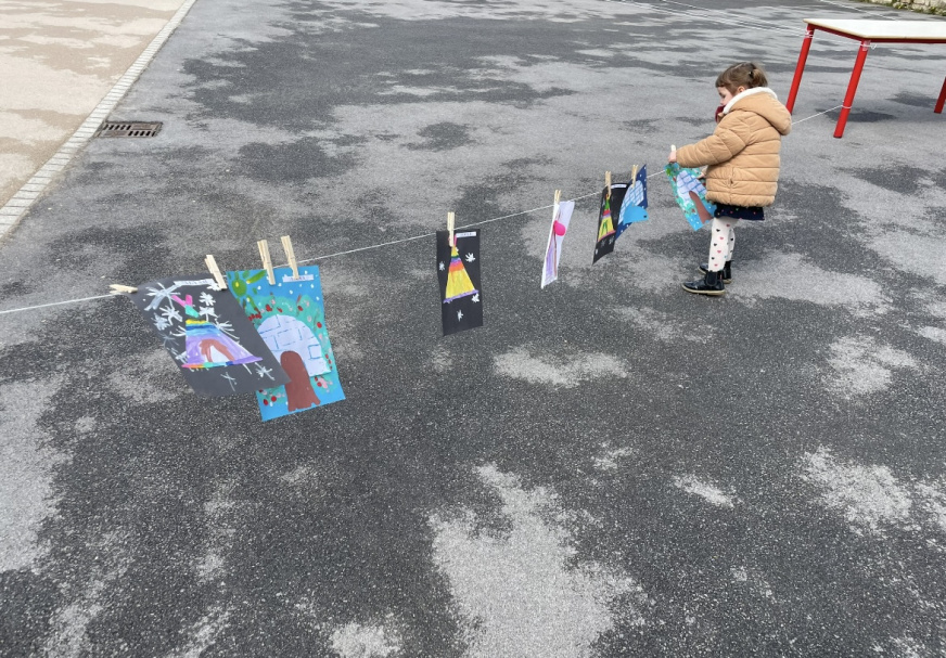 Ensuite les élèves ont accroché leur œuvre (et celles des GS) pendant la récréation.