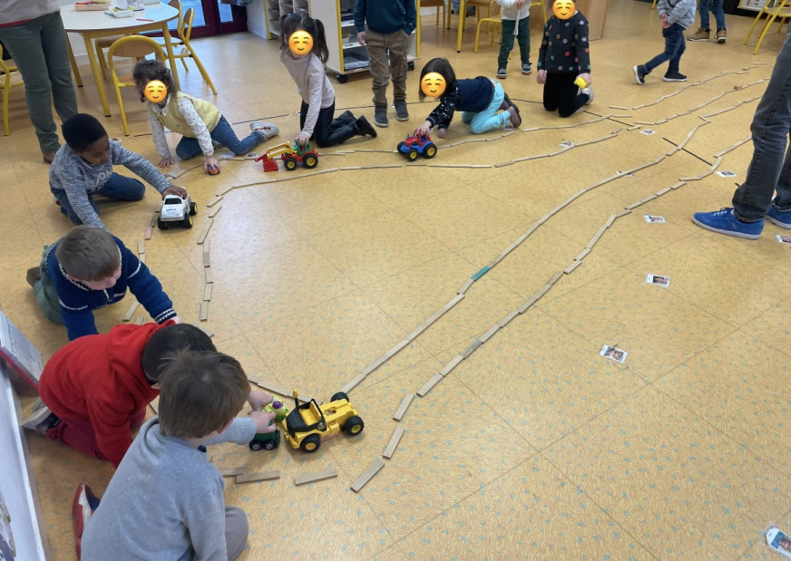 Ce matin nous avons créé un géant parcours en KAPLA dans la classe. L’objectif était de créer un parcours fermé dans lequel on puisse faire des tours à l’infini.