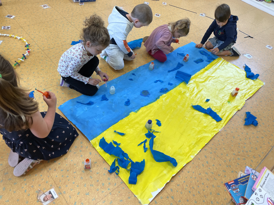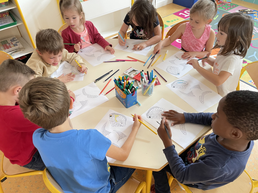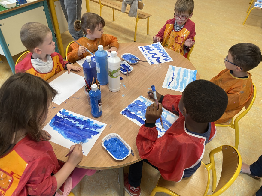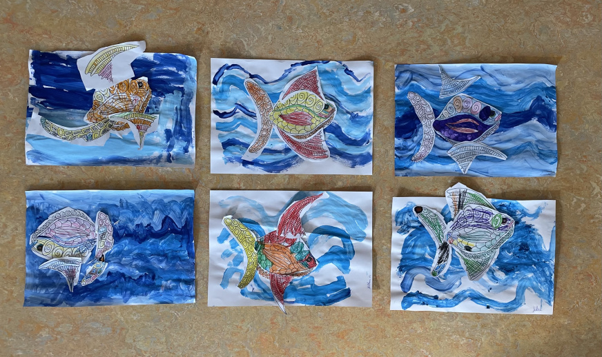 Nous avons colorié un poisson, puis découpé et assemblé les différentes parties de son corps sur la peinture que nous avons faites ce matin.