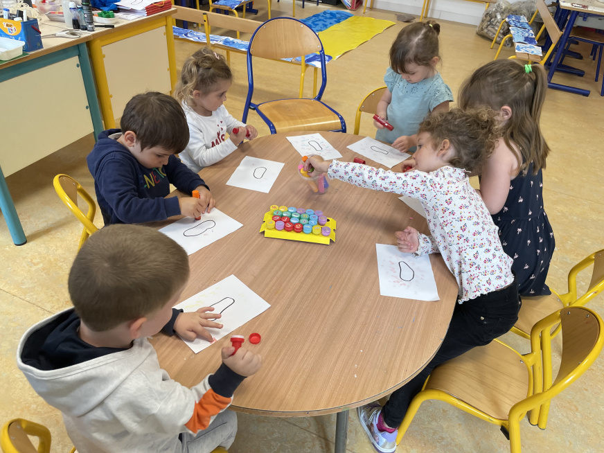 Ce matin nous avons travaillé la notion d’intérieur et d’extérieur avec les TPS/MS. Ils devaient sur une première feuille : mettre les gommettes à l’intérieur du cercle. Et sur la deuxième feuille : tamponner à l’extérieur du cercle.